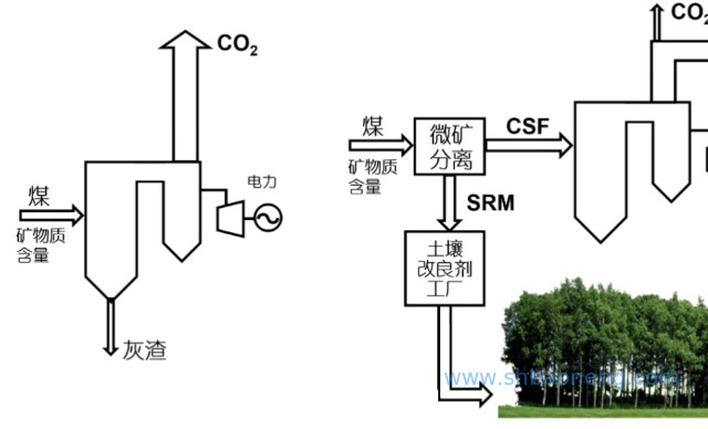 因為傳統的煤炭使用方式燃燒二氧化碳排放產生的灰渣有10%的碳,不光是浪費能源而且現在變成了固廢,整個內蒙古的電廠粉煤灰成災。通過分離之后,該做燃料就做燃料,該做土壤做土壤,分流以后,這邊釋放二氧化碳,更多的森林長起來把二氧化碳吸回來,這樣做了完全可以達到碳中和。(圖5)