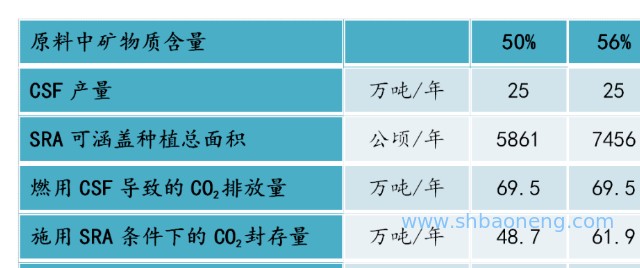 當清潔固體燃料CSF產量達到25萬噸時,我們每年碳排放大約69.5萬噸,根據治理的面積大約可以吸回來20.8萬噸,在施用土壤礦物改良劑SRA條件下,可以吸回來48.7萬噸、61.9萬噸,甚至74.9萬噸。(見下表)